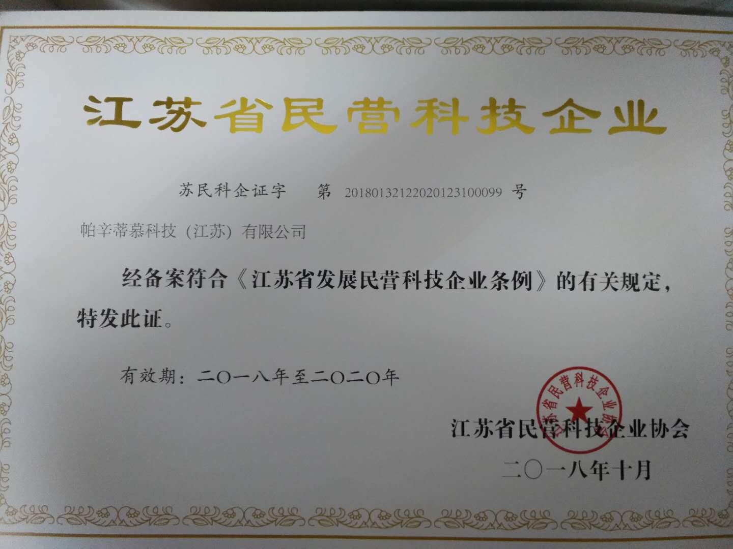 帕辛蒂慕科技(江蘇)有限公司榮獲江蘇省民營科技企業(yè)
